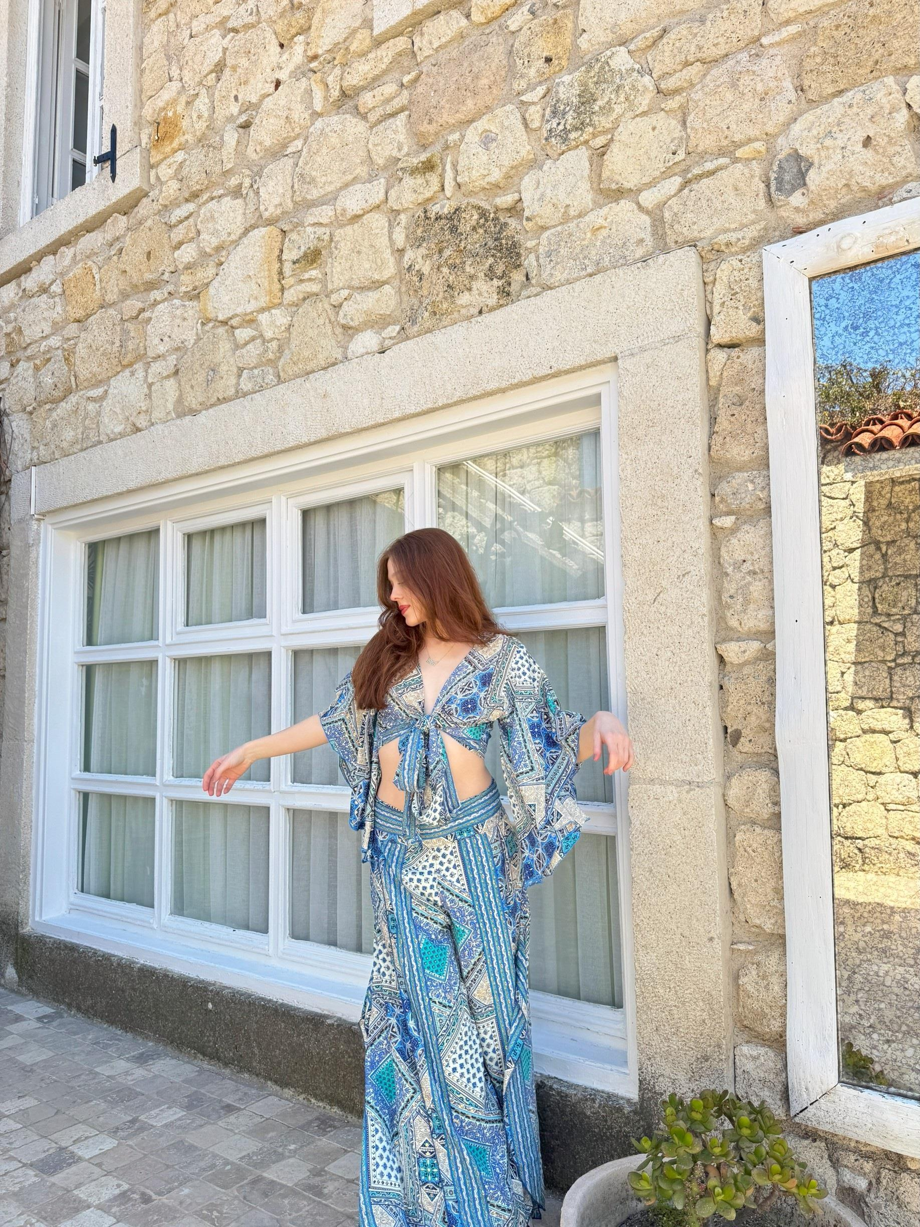 Yazın enerjisini üzerinde taşımak isteyenler için tasarlandı! Desenli bağlamalı crop üst ve yandan yırtmaçlı bol paça pantolon ikilisiyle, hem şıklığı hem rahatlığı bir arada sunuyor. İster sahil kenarında ister şehir sokaklarında özgürce hareket etmen için ideal. Kendini hafif, stilini özgür hisset!
